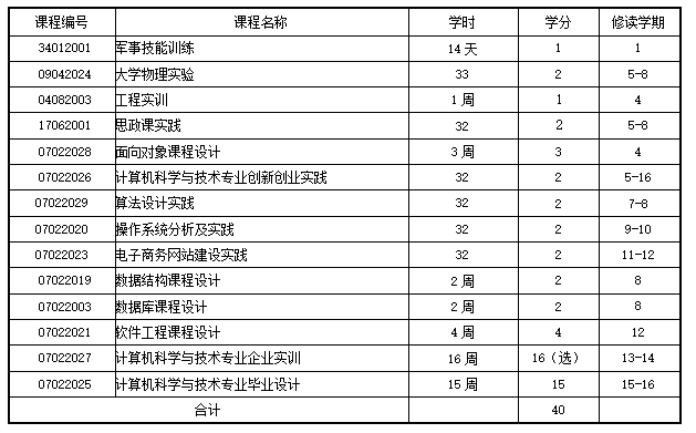 十、计算机科学与技术专业集中性实践教学环节设置