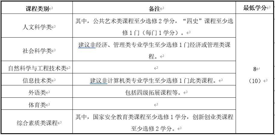 1.建议学生文理互选,在不同类别的通识选修课中完成修读。所有学生在修业年限内应至少取得8个通识教育选修课程学分。