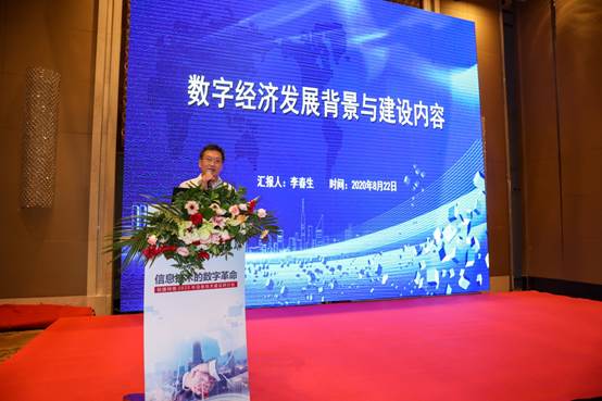 李春生致开幕辞并做了“数字经济发展背景与建设内容”的主题报告,他从数字经济演变与发展、数字经济建设概况、数字经济建设内容和建设实例4个方面向与会嘉宾阐述了信息技术开发者、管理者、服务者如何改变自己,为社会发展做出各自的贡献。