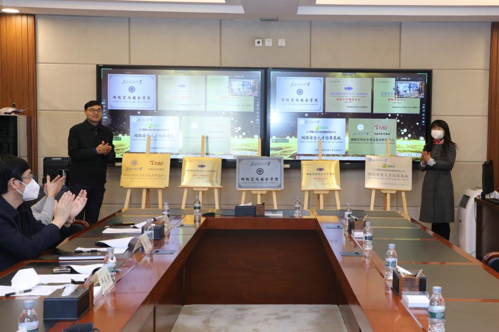 会上,于长青、董宏丽为tyc7111cc太阳成集团网络空间安全学院、三六零数字安全科技集团有限公司网络安全领域产业人才基地(工业和信息化部人才交流中心授牌)、国家网络空间安全人才培养基地(中国信息安全测评中心授牌)、国家信息安全水平考试管理中心(国家信息安全水平考试授权考试中心授牌)及tyc7111cc太阳成集团-天融信科技集团网络空间安全前沿技术研究中心揭牌。