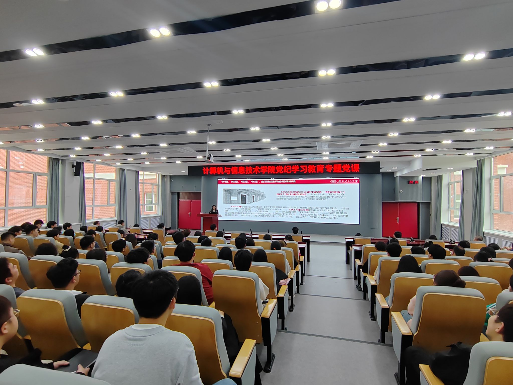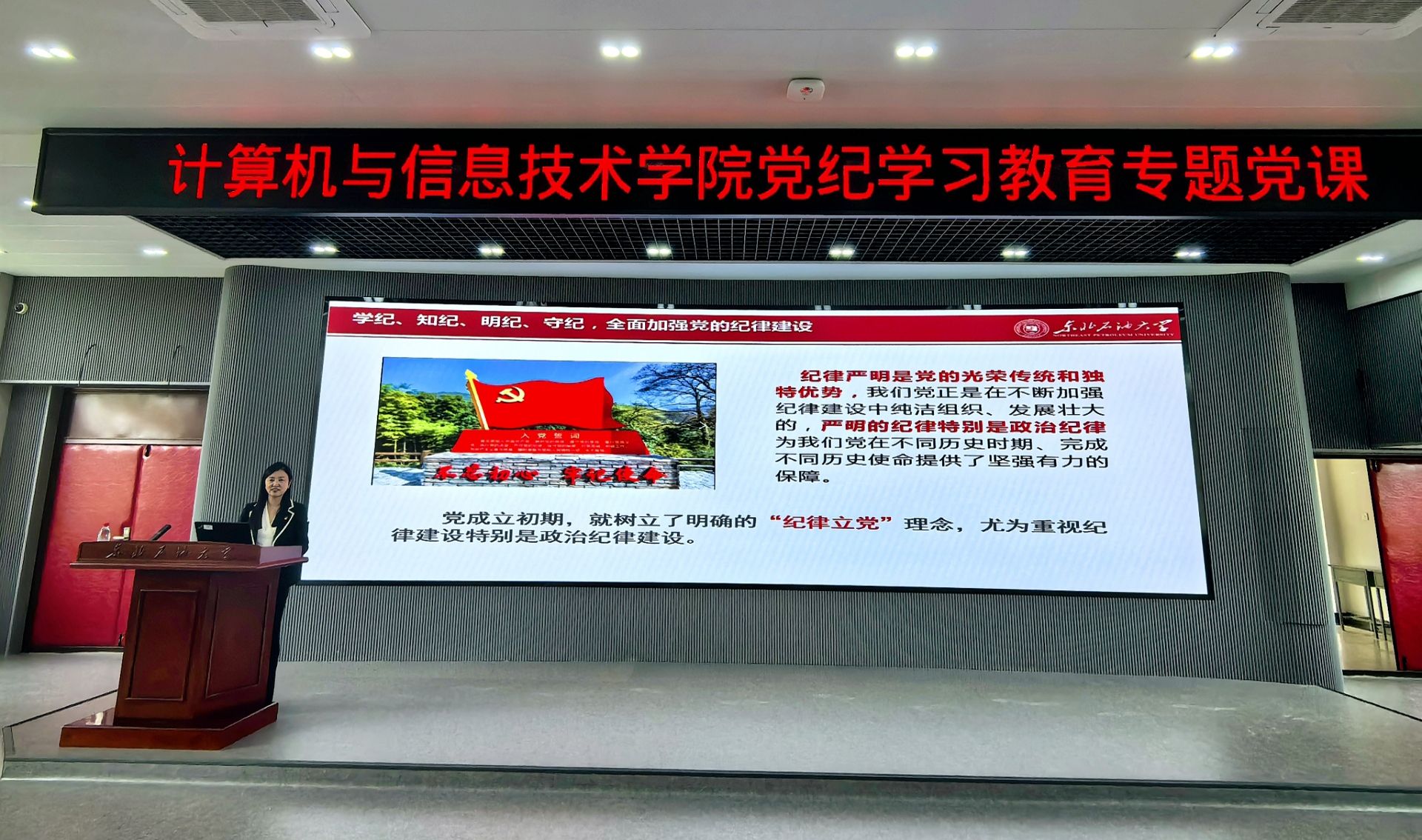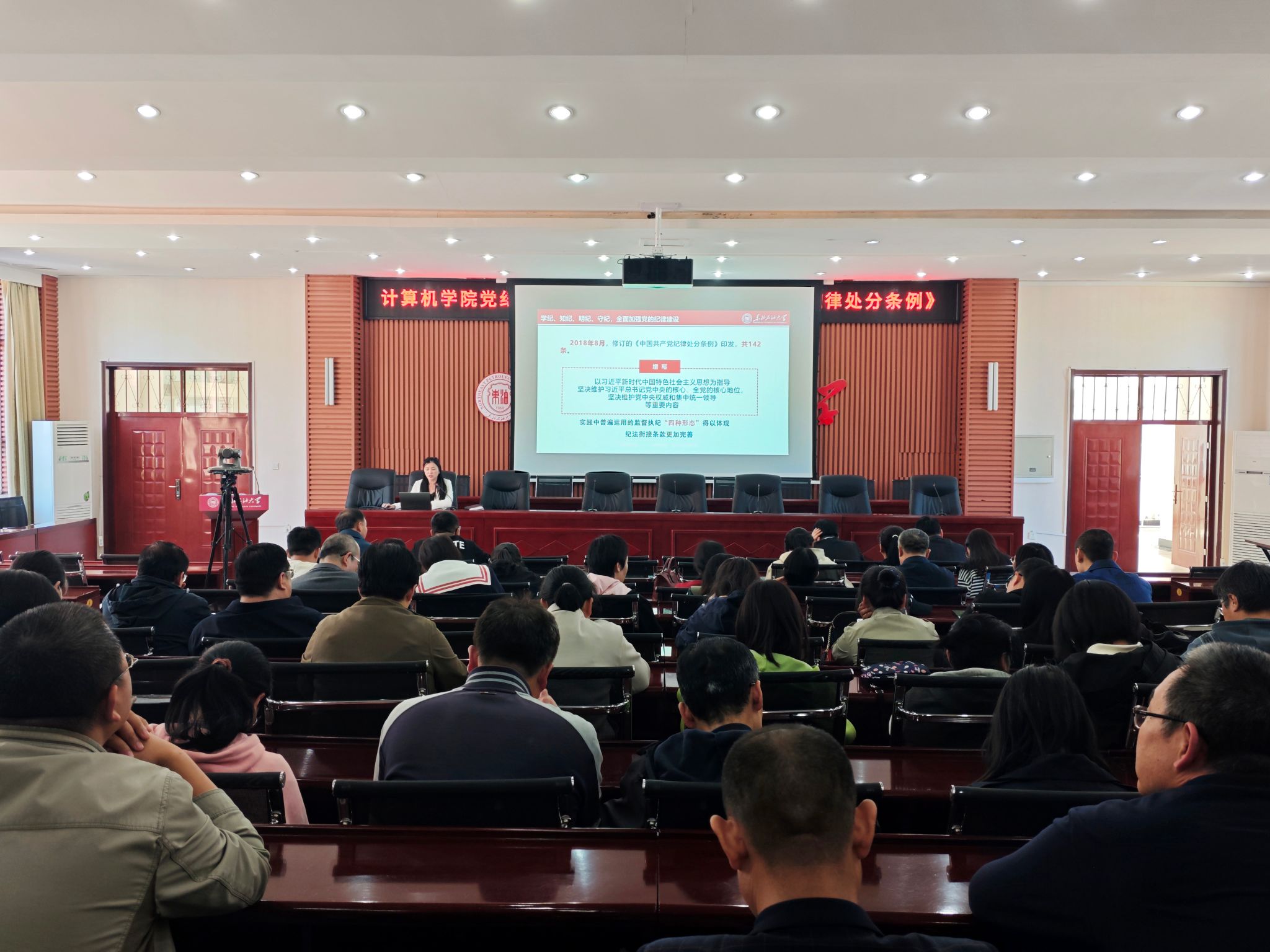 任艳秋从重温党的纪律建设的历史出发,深刻理解加强党的纪律建设的重大意义和2023年修订《中国共产党纪律处分条例》的重要意义。她围绕新版《条例》修订的重点内容进行细致解读,以违反各类纪律的典型案例信息为例,加强“以案说纪、以案说法、以案说德、以案说责”警示教育,推动师生党员深化对《条例》的理解领会和转化运用,进一步增强了师生的党纪意识,强化了党员干部党性观念、纪律意识和廉洁从政意识,筑牢了防腐巨变思想防线。