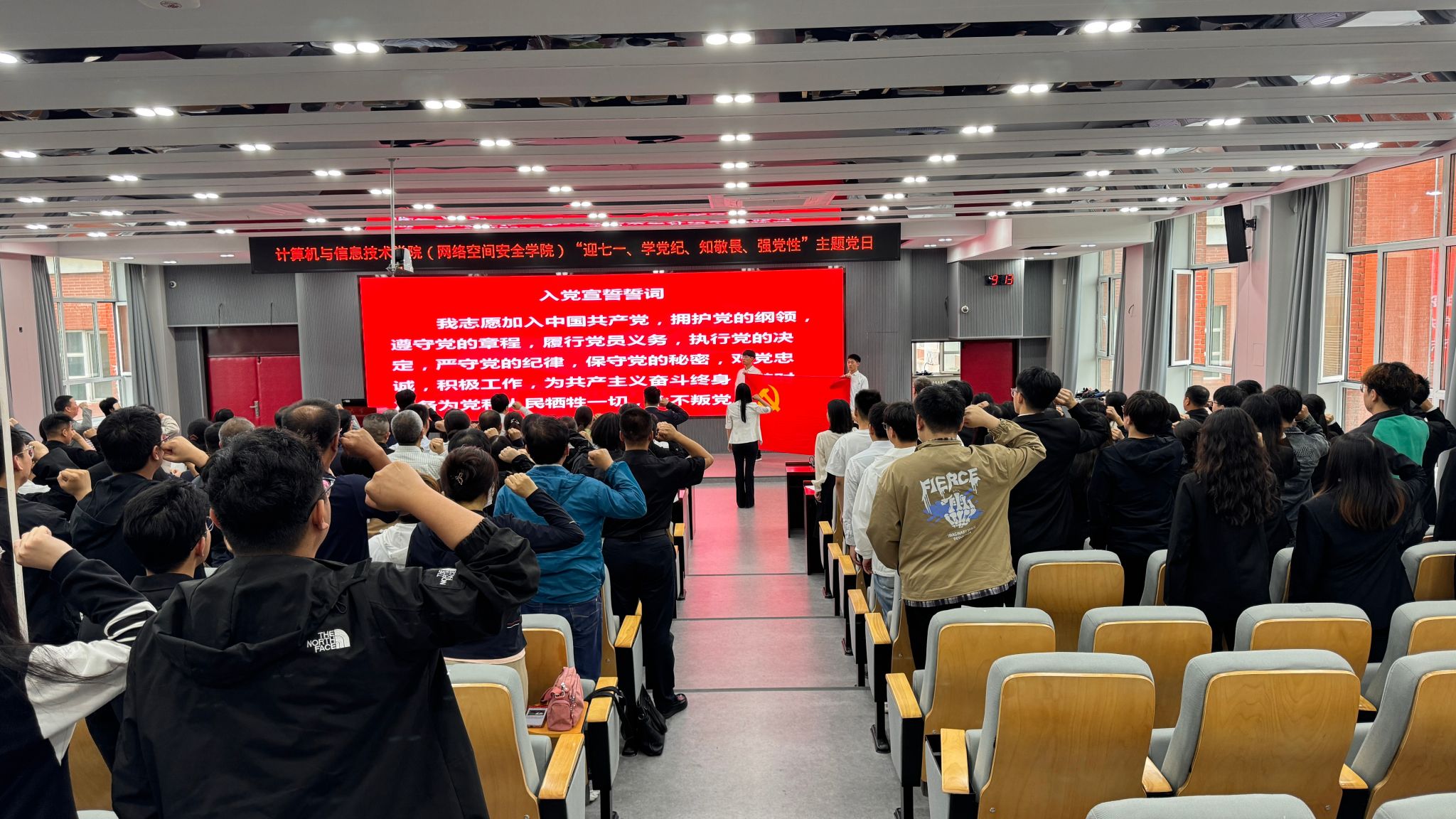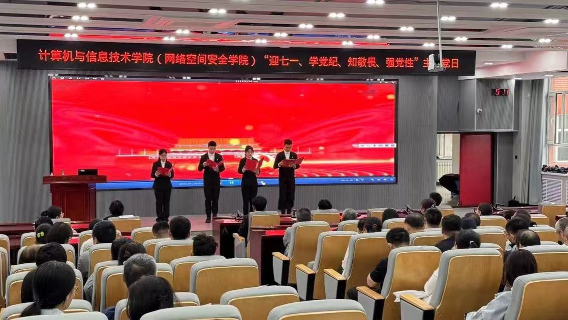 会上,全体党员面向鲜红的中国共产党党旗,神情庄重,高举右拳,在学院党委书记任艳秋的领誓下重温入党誓词,“我志愿加入中国共产党……”铿锵有力、掷地有声的宣誓声久久回荡,表达了党员们对党的赤诚忠心和为共产主义事业奋斗终身的坚定决心。4名学生党员表演的诗词朗诵,表达了计算机学院大学生党员感念党恩,求学报国的信念和决心。