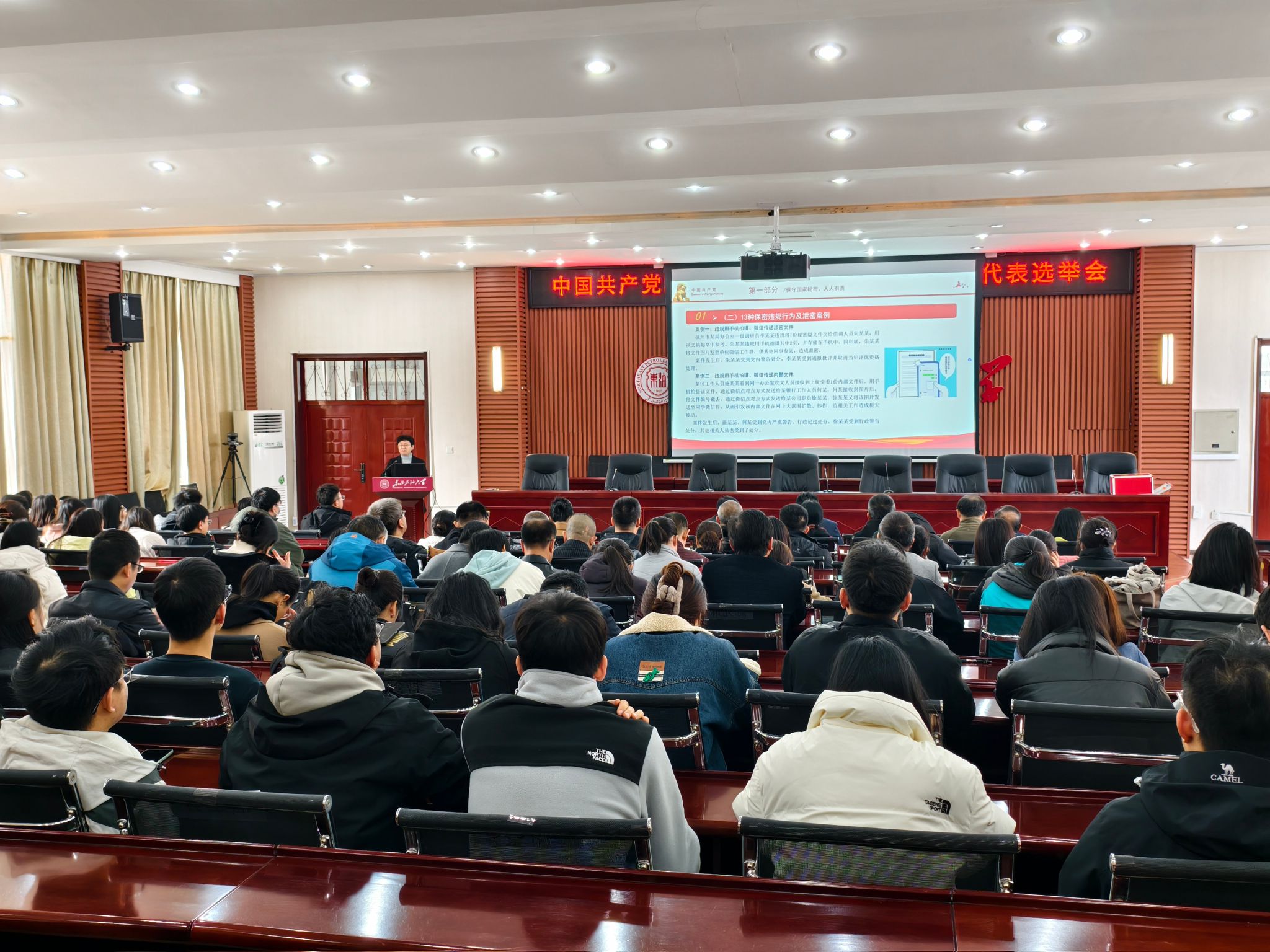 会上,胡畔首先围绕国家秘密的含义和《中华人民共和国保守国家秘密法》中的13种保密违规行为进行了详细的讲解,并结合泄密案例现实说法,推动师生党员深化对《保守国家秘密法》的理解领会和转化运用,进一步增强了师生党员的保密教育。同时,结合学校下发的党员干部操办婚丧喜庆事宜的通知,就该办法的适用范围、定义和原则,以及“七个严禁”和执行报告制度的具体内容,进行了明晰的解读。