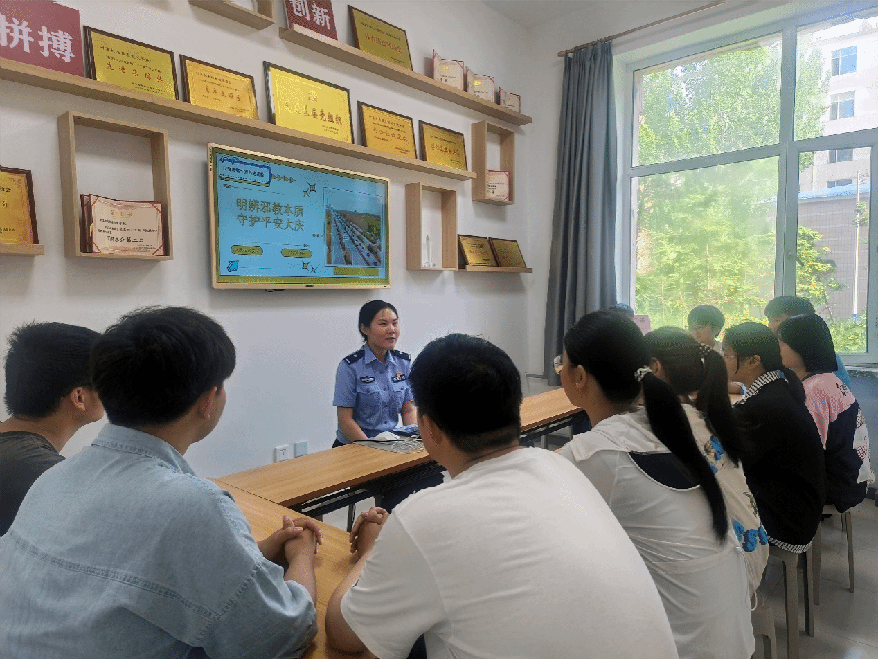 此次宣讲活动是大庆市“百年油田心向党 幸福无邪筑安康”系列主题活动之一。由市公安局反邪教宣传工作业务骨干顾警官主讲,从邪教的种类、演变过程以及邪教本质和危害等方面进行了理论讲解,通过视频教育片、反邪宣传彩页、互动答题等形式向师生普及反邪教知识。通过以点带面形式,积极引导师生自觉远离邪教,进一步提高广大师生识邪辨邪反邪能力。