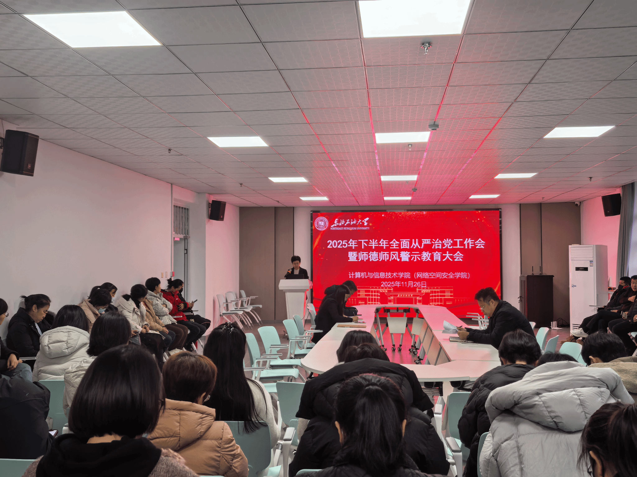 为深入贯彻落实党中央关于全面从严治党要求,筑牢教职工思想防线,扎实开展师德师风教育,2025年11月26日,太阳成集团tyc7111(网络空间安全学院)在第一教学楼D座305会议室召开2025年下半年全面从严治党工作会暨师德师风警示教育大会。会议由学院党委书记任艳秋主持,学院领导班子成员、全体教职工参加会议。