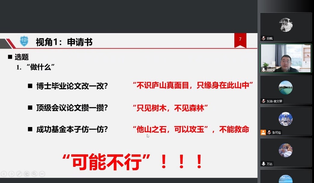 2022年12月3日,应学院邀请,天津大学刘安安教授为我院师生作了题为《浅谈国家自然科学基金项目申报心得》的专题学术报告。本次报告由田枫院长主持,学院教师与研究生共100余人次参与线上交流。