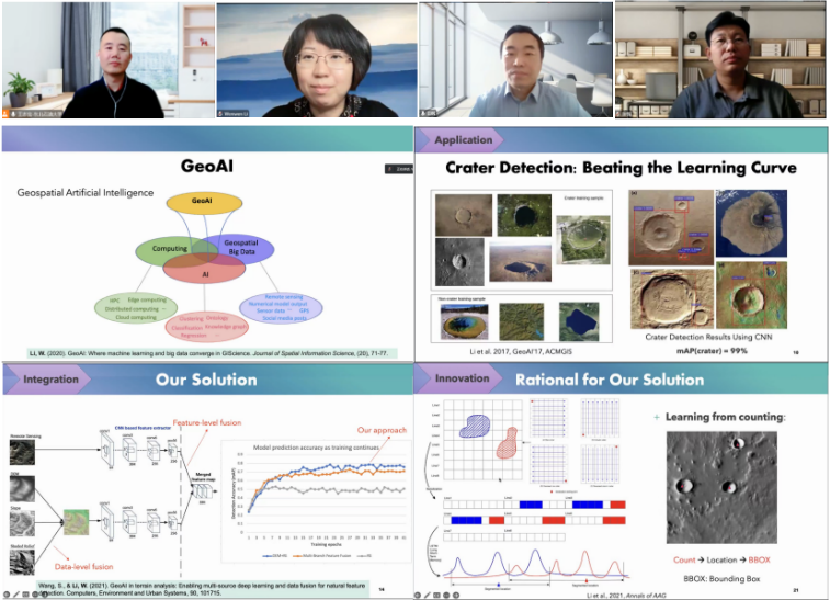 李文雯教授围绕地理人工智能主题,首先为我们介绍了GEOAI(地理人工智能)的概念。以极地气候变化研究为应用背景,分享了其在自然物体检测识别领域的研究成果。在报告中,李教授为我们详细介绍了GEOAI在地物检测方面的应用、利用LSTM+CTC等方法论深入阐述了对陨石坑自然目标进行检测的算法研究以及创新点的提出。最后,报告展望了GEOAI在地理图像分析方面的发展前景和研究方向。