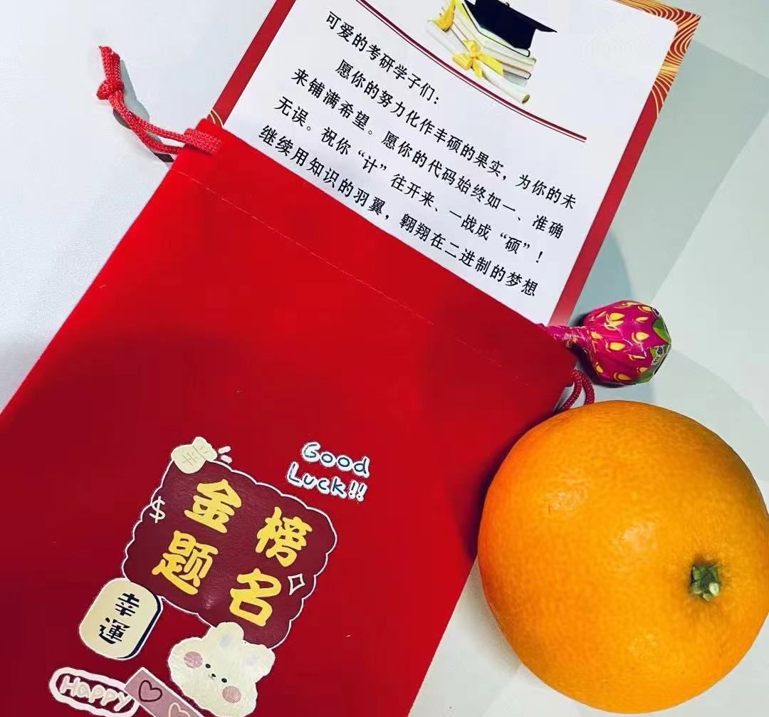 考研礼包中每一份礼物都代表了一份期待,寄托着学院对考研学生的关心与祝福;一颗硕大饱满的橙子,祝愿考研学生心想事“橙”;一个甜甜的棒棒糖祝愿考研学生取得优异成绩,金榜题名;一张明信片,寄托着全院教师的共同祝福,愿考研学子能够“计”往开来,一战成“硕”。