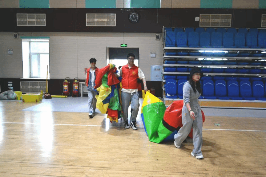运动会准备阶段,在场的一部分志愿者们协助老师们共同布置运动会现场,完成所需道具的摆放。