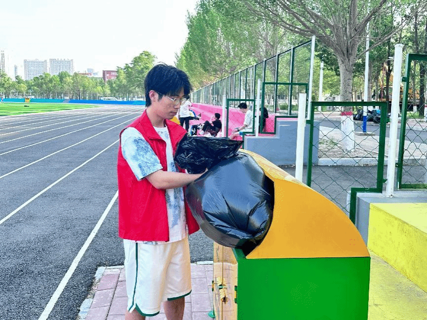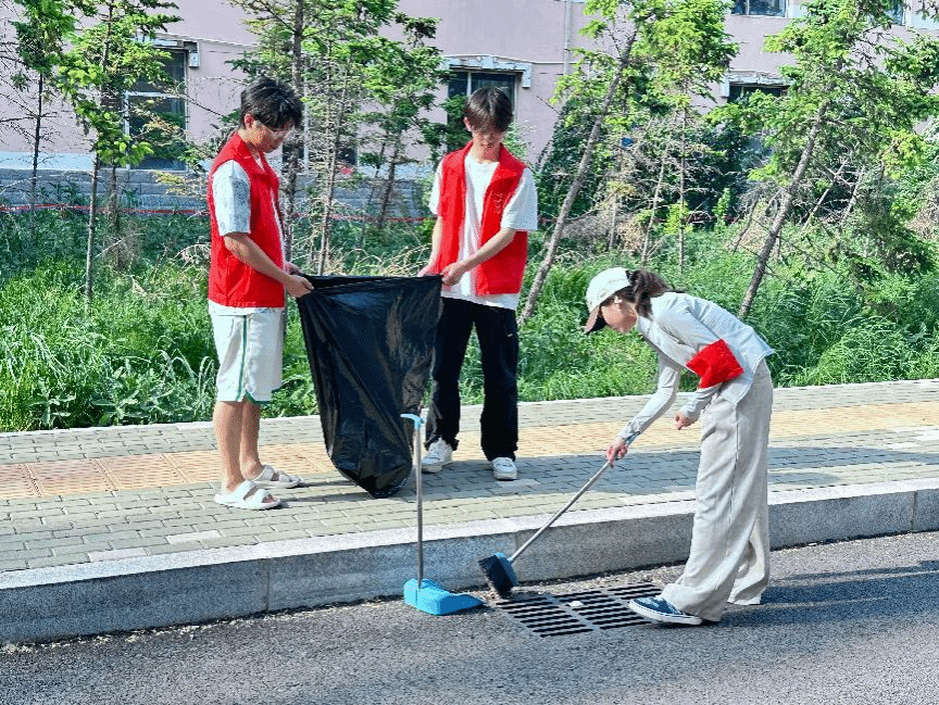 在校园主干道上,志愿者们手持扫帚、簸箕,仔细清扫路面上的落叶、纸屑、烟头等垃圾,不放过任何一个角落。他们有的弯腰捡拾缝隙中的杂物,有的推着垃圾车及时清运清扫出来的垃圾,分工明确,配合默契。经过一番努力,原本散落着垃圾的主干道变得干净整洁,焕然一新。