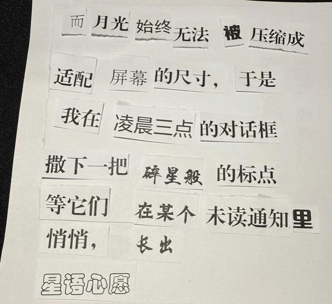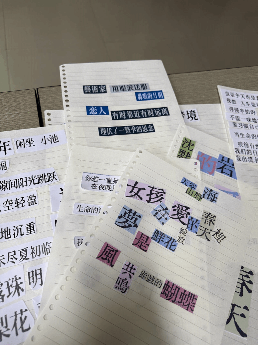 活动过程中,学生围绕“数字时代的情绪密码”、“普通生活中的浪漫”等主题,通过联想、重组完成微型诗歌创作。同学在纸上拼出“404错误不可怕,至少证明,我在寻找一条未被定义的路。”将HTTP状态码转化为探索未知的勇气宣言,展现出数字通信中的情感韧性。