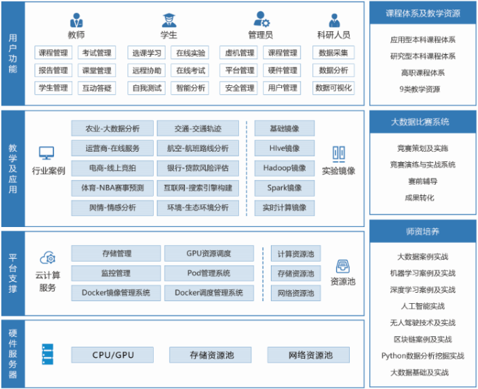 基于OBE理念的大数据与人工智能平台是国内首家采用Docker+OpenStack混合技术架构,能够满足高校教学、实验、实训、科研和比赛的综合应用平台。大数据与人工智能教学平台由三个系统组成:普开大数据实验管理平台系统、普云云计算管理系统和普开镜像仓库管理系统。拥有课程、案例两大体系建设方案及12大行业项目案例,2个教学班能够应用平台同时上课,全面满足高校大数据与人工智能实验教学要求,全面提升学生实践能力,缩短课程开发周期,快速培养综合性、复合型大数据人才。