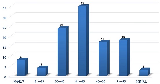 教师队伍年龄呈现正态分布,结构合理。35岁以下教师12人,占全部教师的11.01%;36岁至40岁教师24人,占全部教师的22.02%;41岁至45岁教师35人,占全部教师的32.11%;46岁至50岁教师17人,占全部教师的15.6%;51岁至55岁教师18人,占全部教师的16.51%;56岁以上教师3人,占全部教师的2.75%。